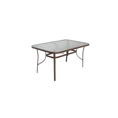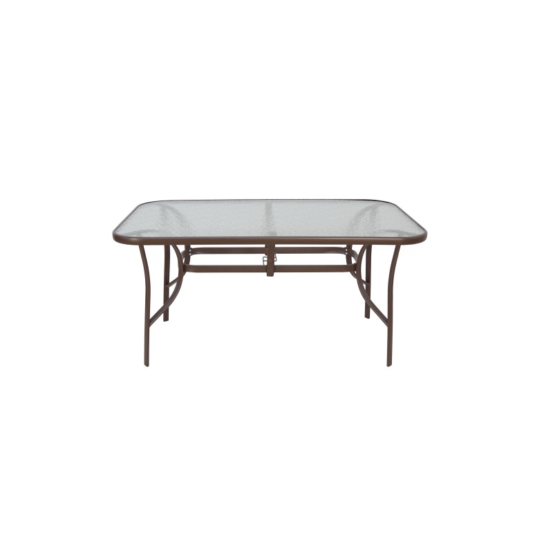 Ένα τραπέζι μεταλλικό εξωτερικού χώρου σε χρώμα καφέ, με ενσωματωμένο τζάμι ασφαλείας (secure).