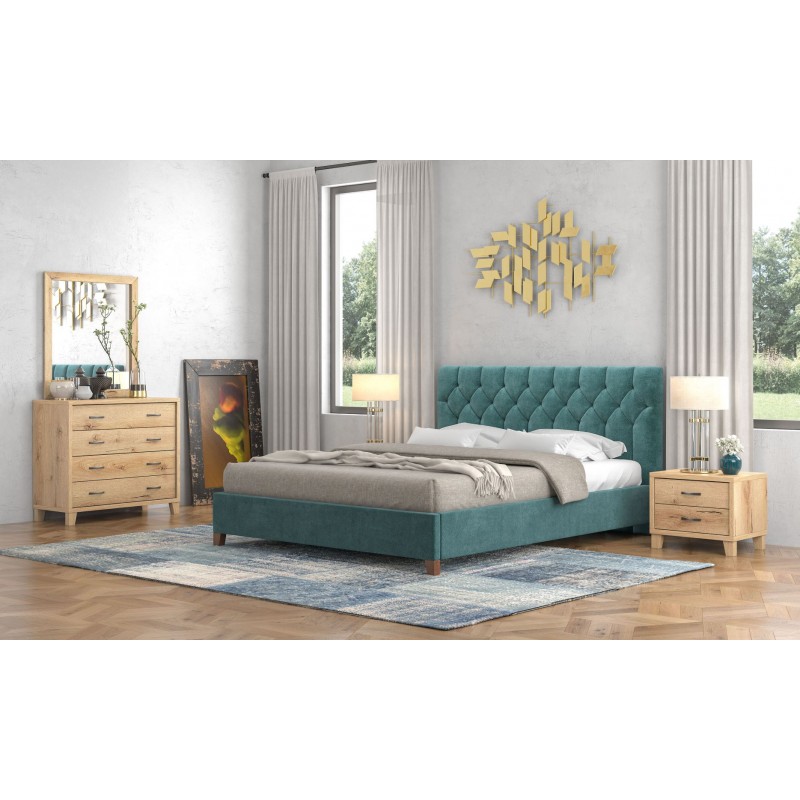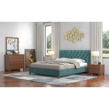 Κρεβάτι υπέρδιπλο επενδεδυμένο από υψηλής ποιότητας ύφασμα σε απόχρωση μπλε.