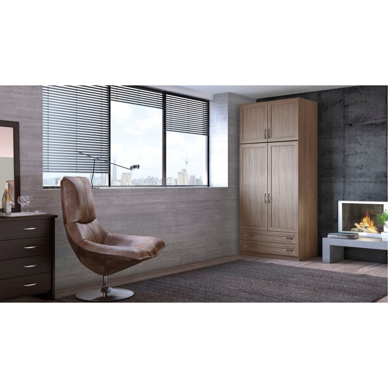 Ευρύχωρη και στιβαρή ντουλάπα από υψηλής ποιότητας μελαμίνη με μεγάλο πατάρι και σχεδιασμό νταμπλά στις πόρτες σε απόχρωση μόκα και με inox χερούλια.
