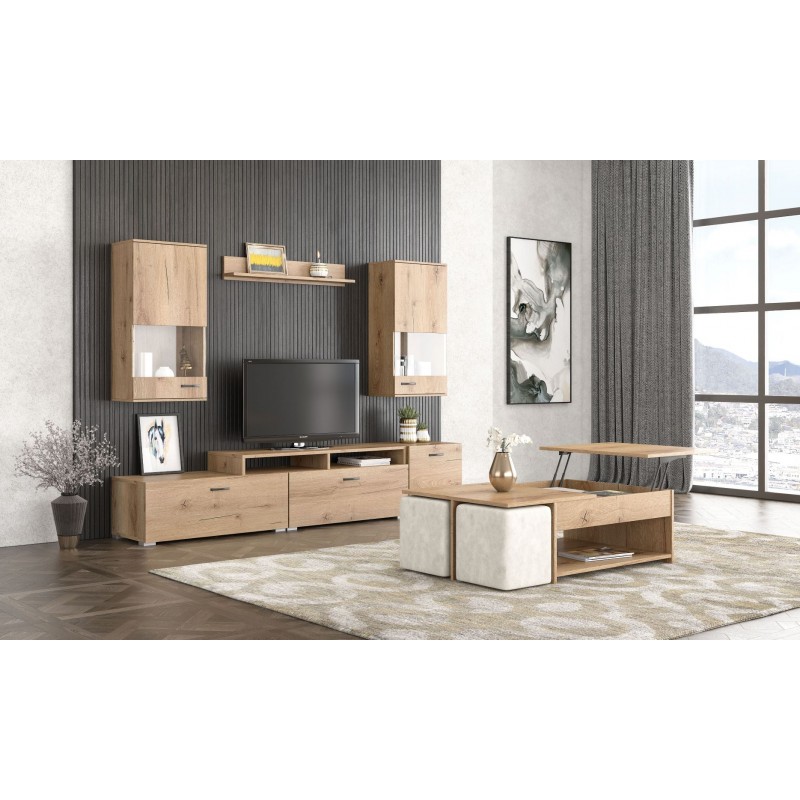 Τραπεζάκι σαλονιού από υψηλής ποιότητας μελαμίνη σε μελί απόχρωση με δύο λευκά αναπαυτικά σκαμπό με αποθηκευτικό χώρο στο πανω μέρος και ανοιγόμενο τραπεζάκι με εξαιρετικής κατασκευής μηχανισμό, επιπλέον υπάρχει μεγάλος βοηθητικός χώρος στο κάτω μέρος.