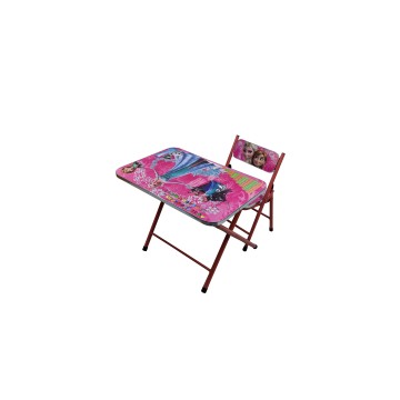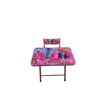 Σετ μεταλλικό αποτελούμενο από ένα τραπέζι-θρανιο πολύχρωμο πτυσσόμενο και ένα καρεκλάκι αντίστοιχων ιδιοτήτων επενδυμένα με παιδικές παραστάσεις.