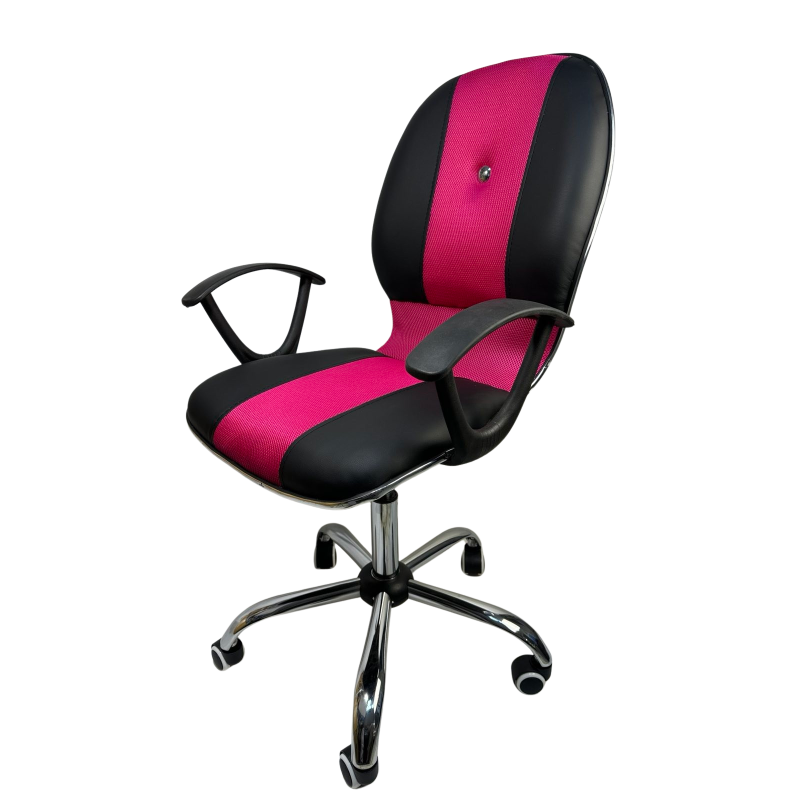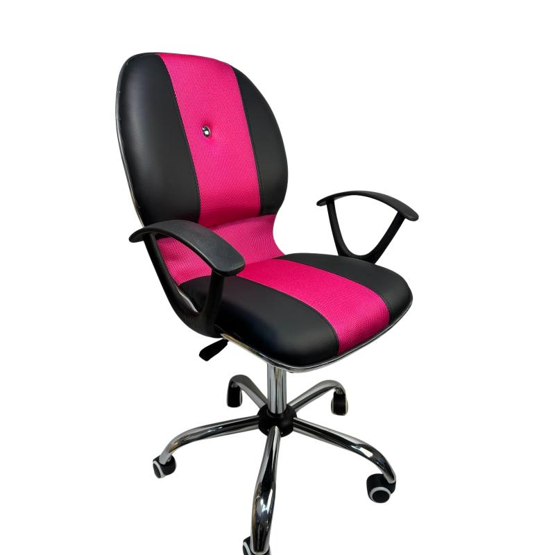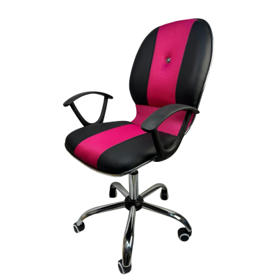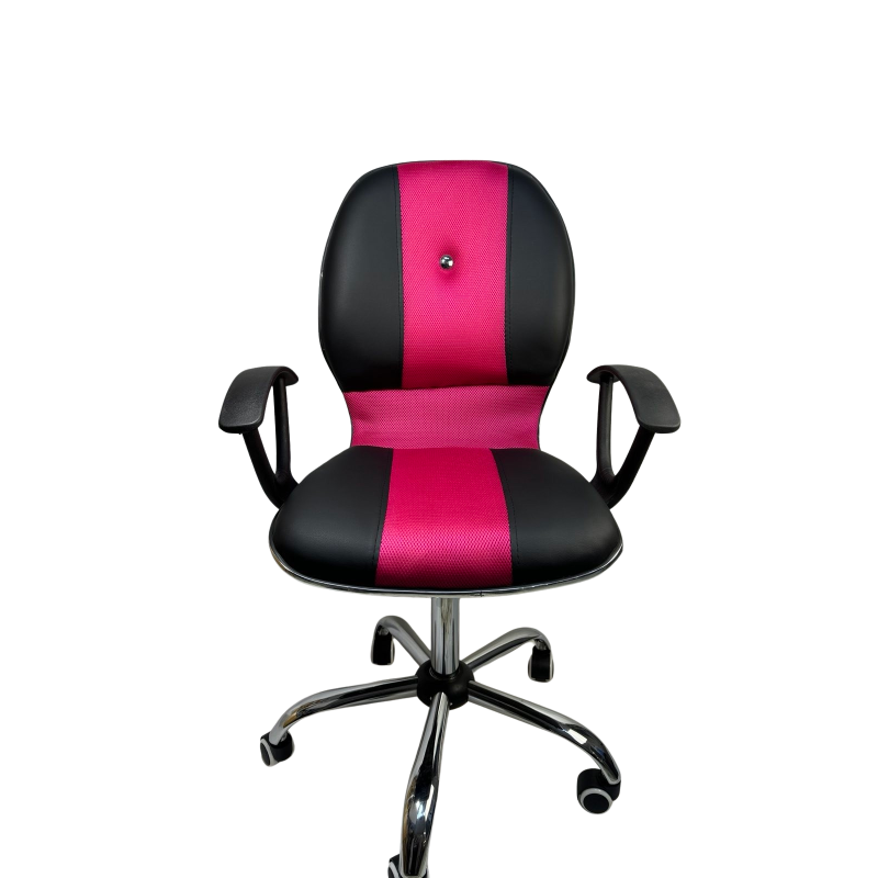 Παιδική καρέκλα γραφείου ροζ με μαύρο κουμπί με μπράτσα με διάτρητο ύφασμα με τεχνοδερμα και μεταλλική τροχήλατη βάση 70x50x90εκ