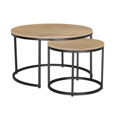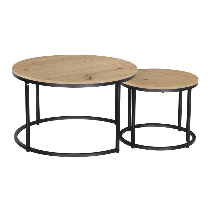 Τραπέζια σαλονιού στρογγυλά σετ 2τεμ όψη ξύλου με μεταλλικό μαύρο σκελετό CJ-N2104 80x80x48εκ