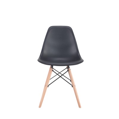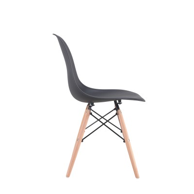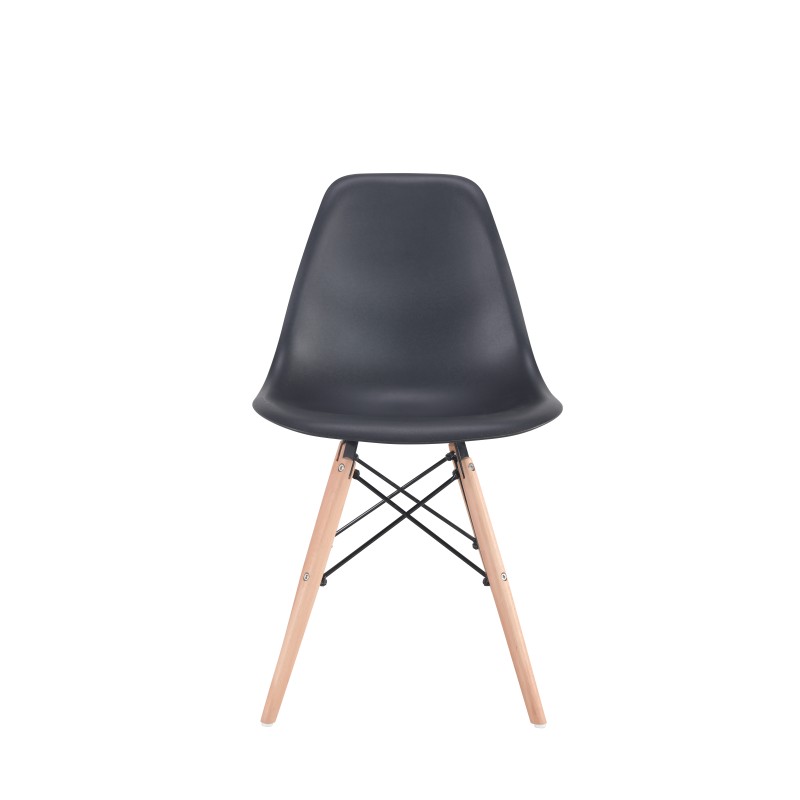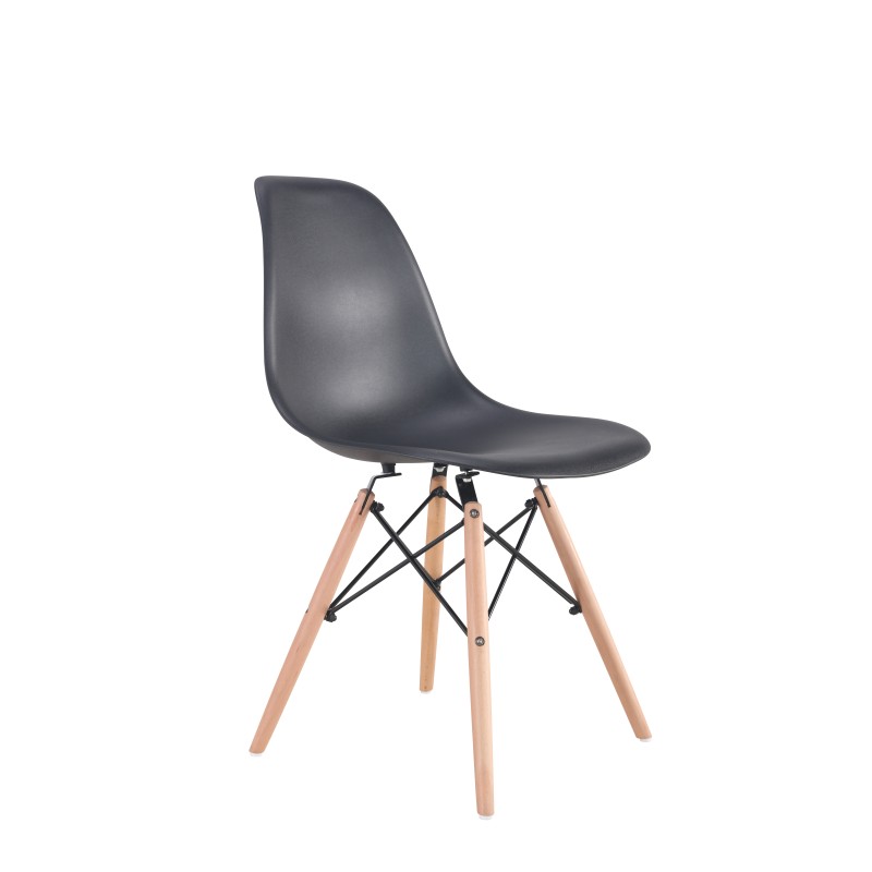 Μία μοντέρνα καρέκλα κατασκευασμένη από ξύλινο σκελετό και κάθισμα πολυπροπυλενίου σε μαύρη απόχρωση.