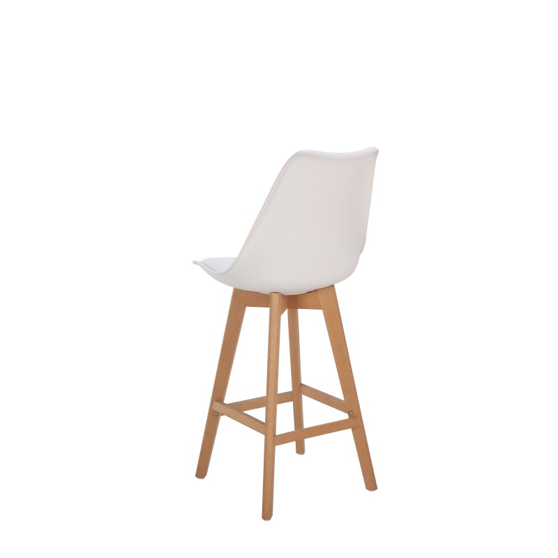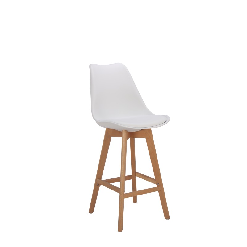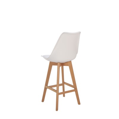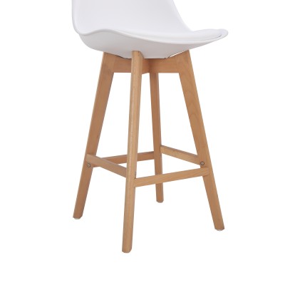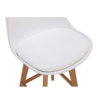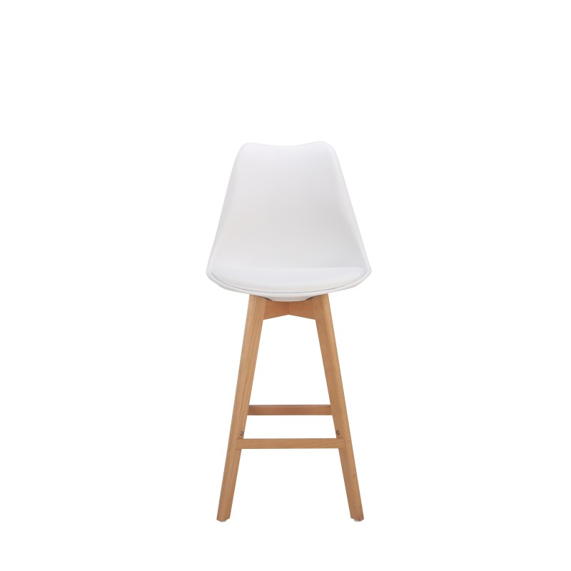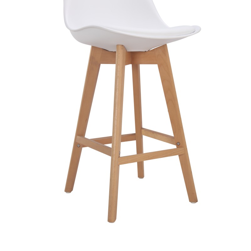 Σκαμπώ μπαρ εσωτερικού χώρου. Είναι κατασκευασμένο από ξύλινο σταθερό σκελετό σε φυσικό χρώμα. Το κάθισμά του είναι από πολυπροπυλένιο εξαιρετικής αντοχής σε λευκό χρώμα. Επιπλέον, διαθέτει αναπαυτικό μαξιλάρι στο κάθισμα, επενδυμένο από τεχνόδερμα σε απόχρωση λευκό, που θα σας προσφέρει μεγαλύτερη άνεση. Μία μοντέρνα και μίνιμαλ επιλογή που θα ολοκληρώσει το design του χώρου σας.