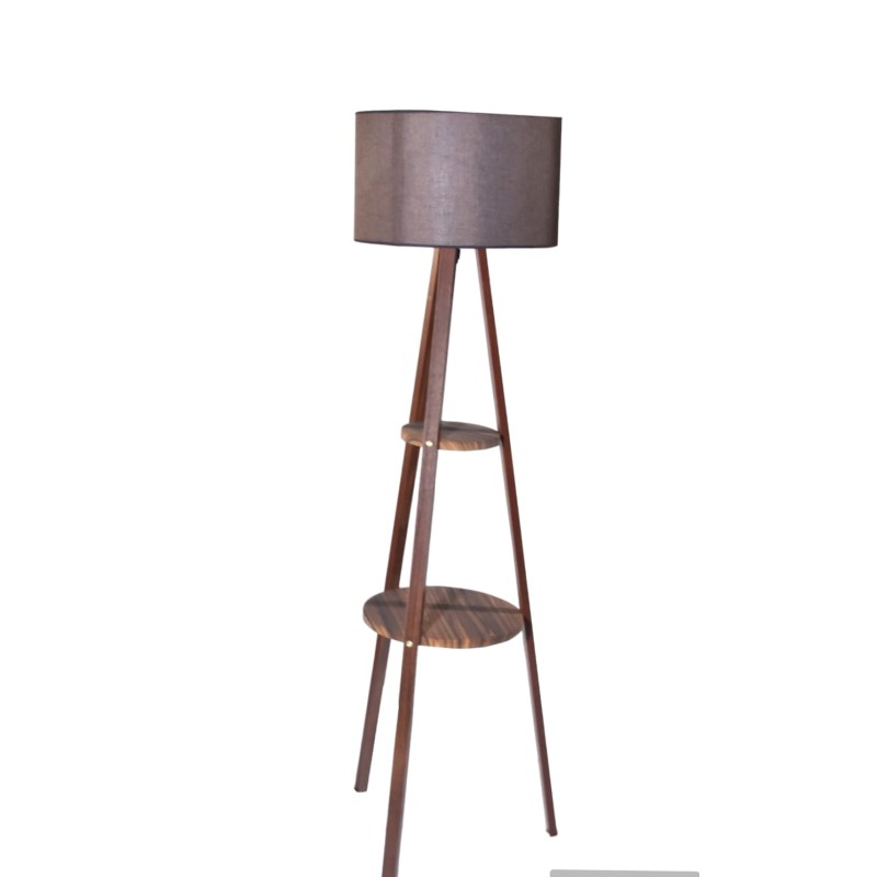 Φωτιστικό λάμπα δαπέδου ξύλινη Ε27 με υφασμάτινο καπέλο δυο βοηθητικούς χώρους καφέ 150XΦ45εκ