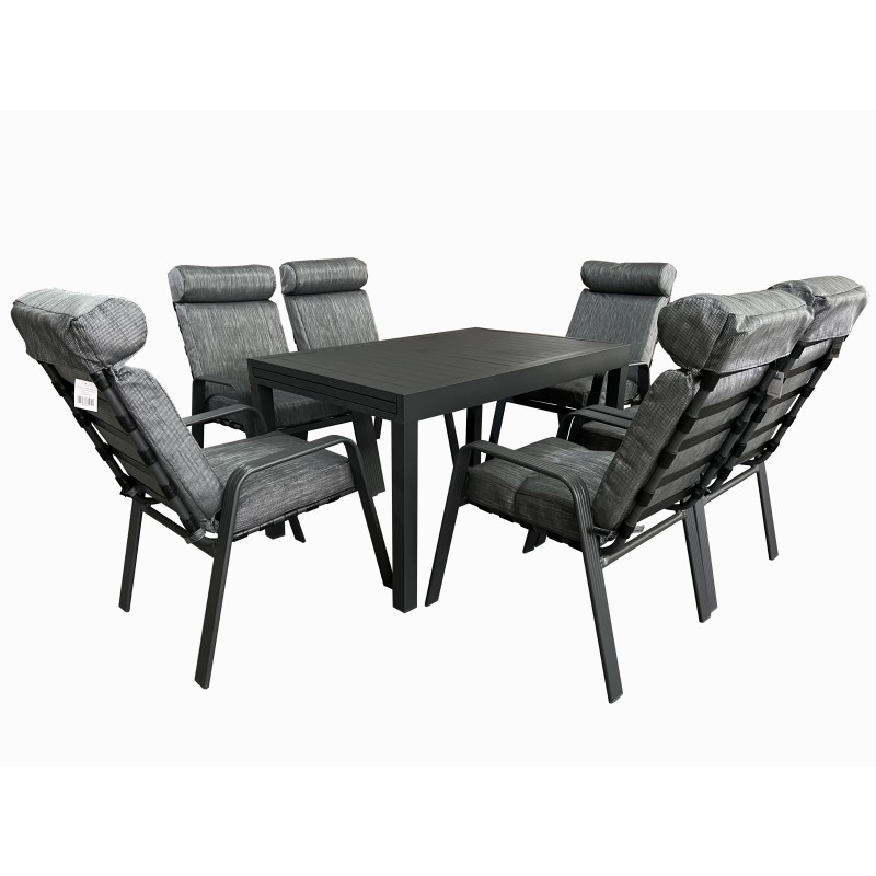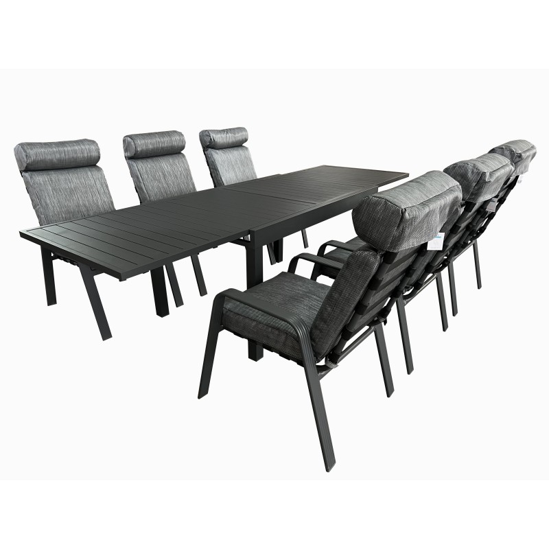 Σετ τραπεζαρίας επεκτεινόμενο εξωτερικού χώρου κατασκευασμένη από αλουμινίο και ύφασμα textilene υψηλής ποιότητας και ανθεκτικότητας στον χρόνο σε χρώμα ανθρακί. Μία κομψή επιλογή τόσο για τον προσωπικό όσο και για τον επαγγελματικό σας χώρο καθώς μπορεί να συνδυαστεί με μεγάλη ποικιλία χρωμάτων και επίπλων. Ιδανική επιλογή για να κοσμήσει το μπαλκόνι ή τον κήπο σας και μπορεί να σας χαρίσει στιγμές αναπαυτικότητας και χαλάρωσης. Η τραπεζαρία μπορεί να είναι το σημείο όπου θα συναντάτε την οικογένεια και τους φίλους σας. Αποτελείται από έξι πολυθρόνες και ένα τραπέζι.