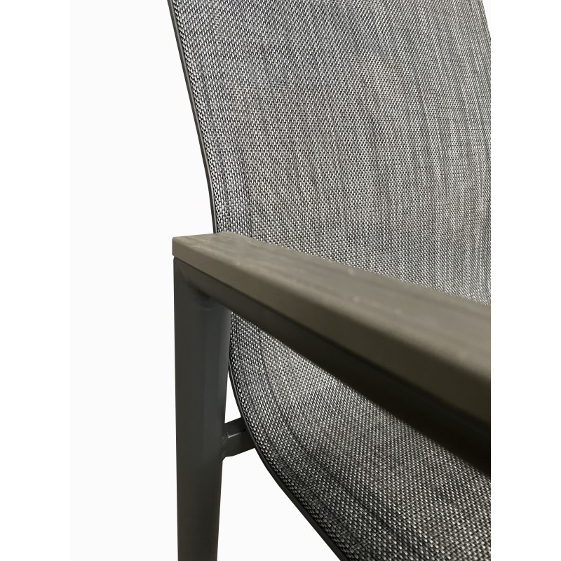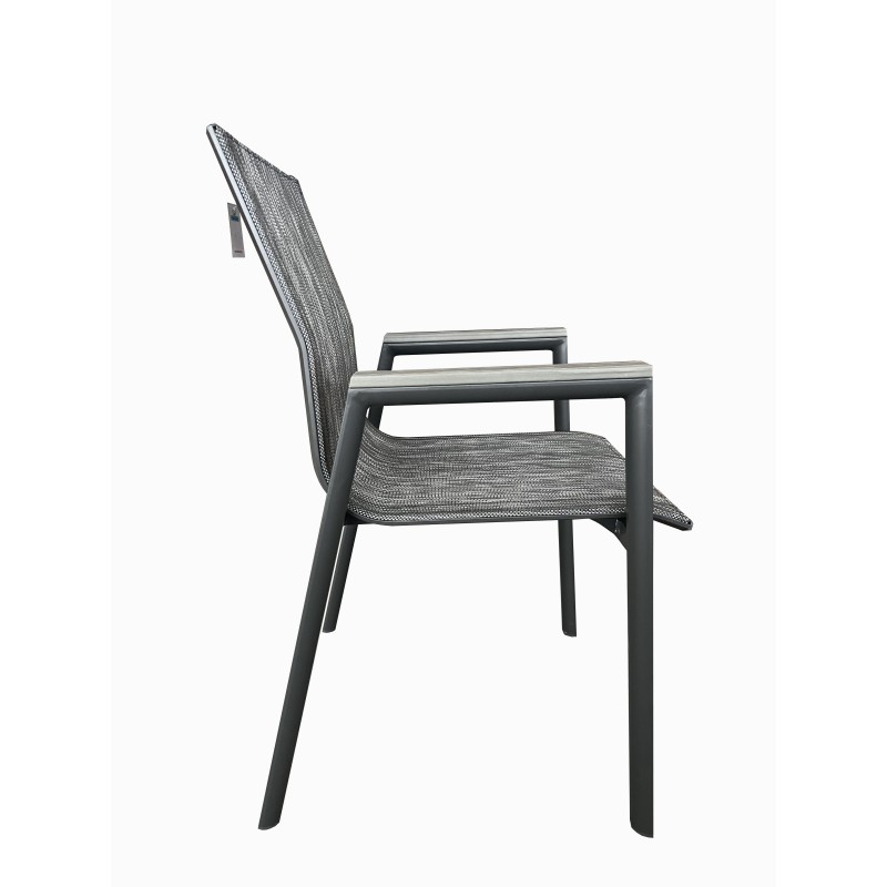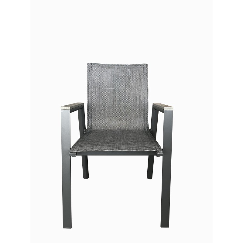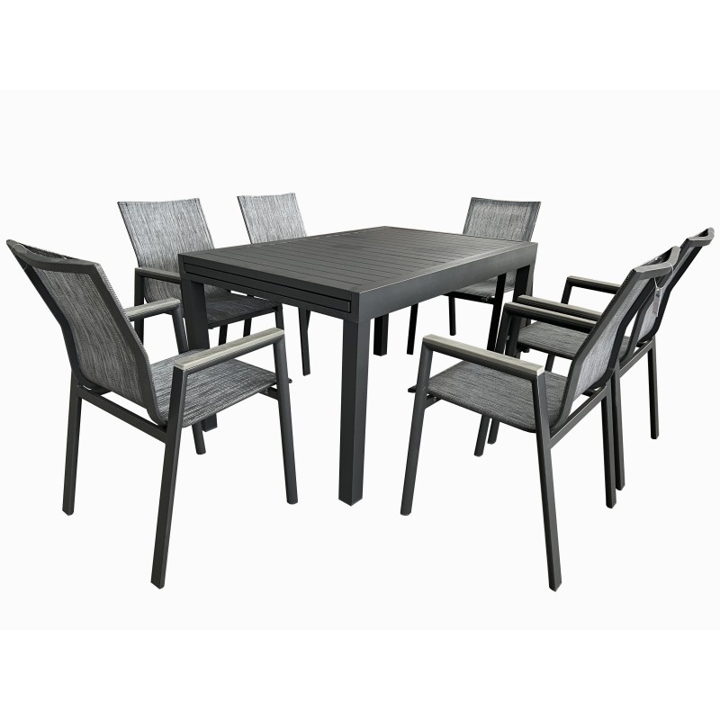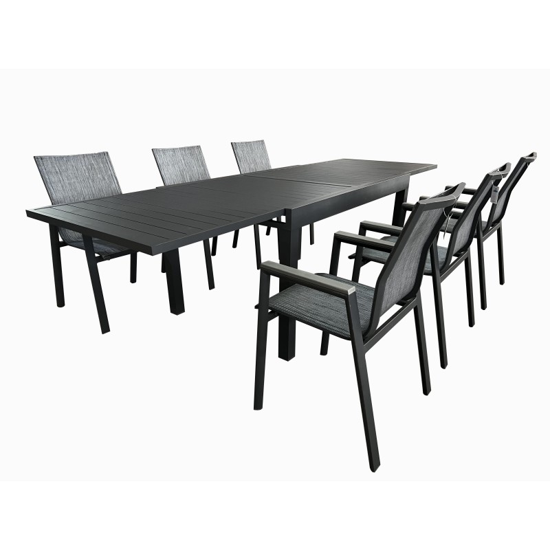 Σετ τραπεζαρίας επεκτεινόμενο εξωτερικού χώρου κατασκευασμένη από αλουμινίο και ύφασμα textilene υψηλής ποιότητας και ανθεκτικότητας στον χρόνο σε χρώμα ανθρακί. Μία κομψή επιλογή τόσο για τον προσωπικό όσο και για τον επαγγελματικό σας χώρο καθώς μπορεί να συνδυαστεί με μεγάλη ποικιλία χρωμάτων και επίπλων. Ιδανική επιλογή για να κοσμήσει το μπαλκόνι ή τον κήπο σας και μπορεί να σας χαρίσει στιγμές αναπαυτικότητας και χαλάρωσης. Η τραπεζαρία μπορεί να είναι το σημείο όπου θα συναντάτε την οικογένεια και τους φίλους σας. Αποτελείται από έξι πολυθρόνες και ένα τραπέζι.