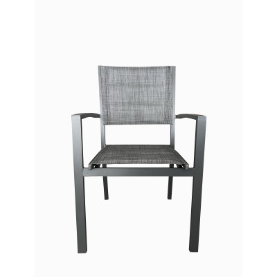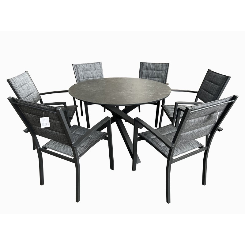 Σετ τραπεζαρίας εξωτερικού χώρου κατασκευασμένη από αλουμινίο και ύφασμα textilene υψηλής ποιότητας και ανθεκτικότητας στον χρόνο σε χρώμα ανθρακί. Μία κομψή επιλογή τόσο για τον προσωπικό όσο και για τον επαγγελματικό σας χώρο καθώς μπορεί να συνδυαστεί με μεγάλη ποικιλία χρωμάτων και επίπλων. Ιδανική επιλογή για να κοσμήσει το μπαλκόνι ή τον κήπο σας και μπορεί να σας χαρίσει στιγμές αναπαυτικότητας και χαλάρωσης. Η τραπεζαρία μπορεί να είναι το σημείο όπου θα συναντάτε την οικογένεια και τους φίλους σας. Αποτελείται από έξι πολυθρόνες και ένα τραπέζι.