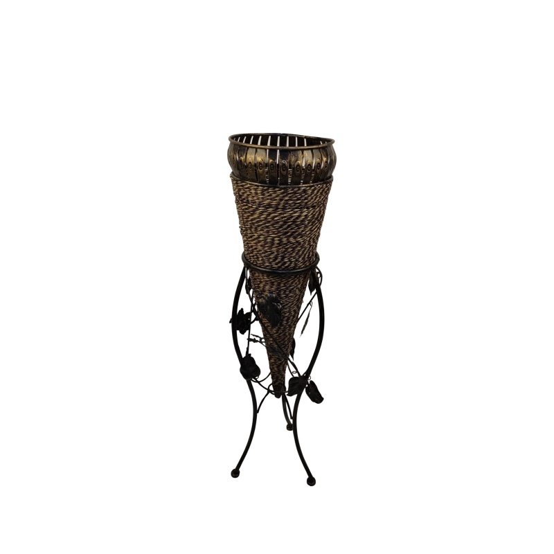 Διακοσμητικό ανθοδοχείο κηροπήγιο ομπρελοθήκη επιδαπεδιο χειροποίητο από μεταλλικό σκελετό πλεγμένο με σχοινί διακοσμημένο με μεταλλικά φύλα με αποσπομενη βάση μπρονζε χρώμα