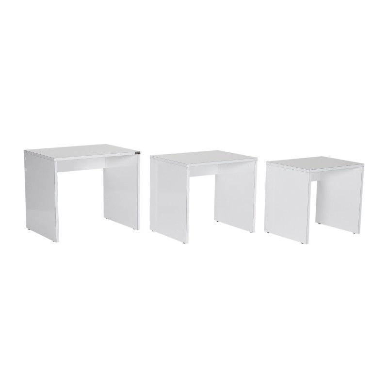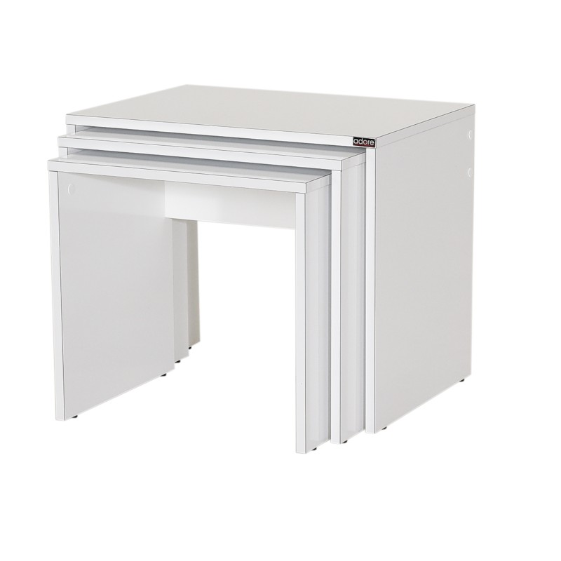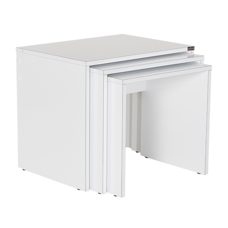 Τα 3 βοηθητικά τραπεζάκια ήρθαν για να κλέψουν την παράσταση με το στυλ και την πρακτικότητά τους. Η επιφάνειά τους είναι από μελαμίνη 18mm σε Λευκό χρώμα , ενώ τα πόδια τους είναι συμπαγή. Το χαρακτηριστικό τους είναι ότι έρχονται σε 3 διαφορετικά ύψη εξυπηρετώντας κάθε ανάγκη στον χώρο του σαλονιού.