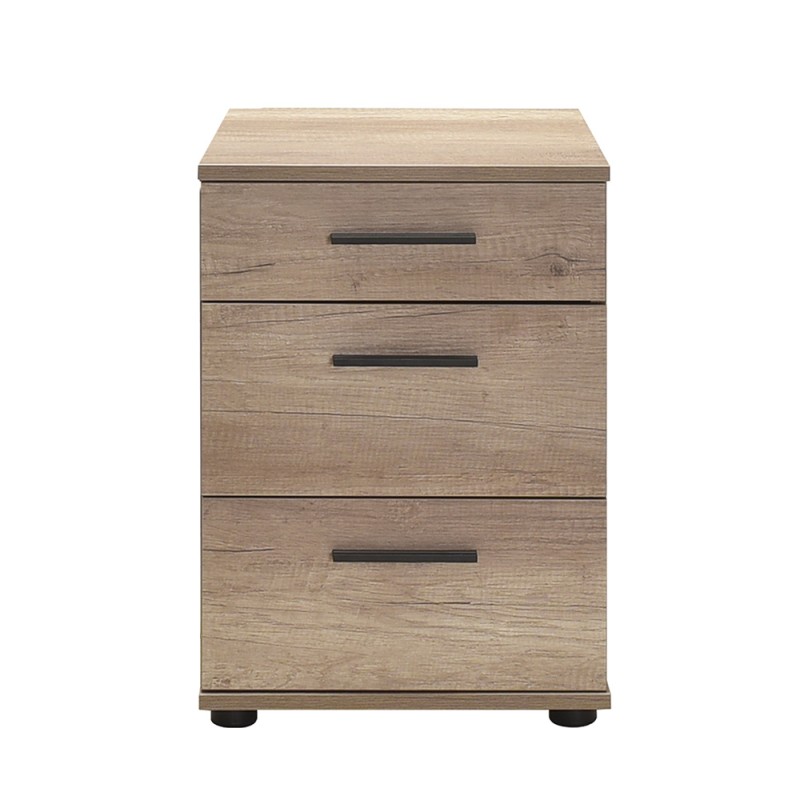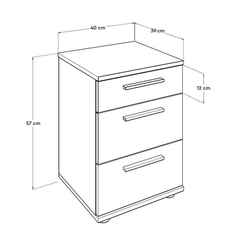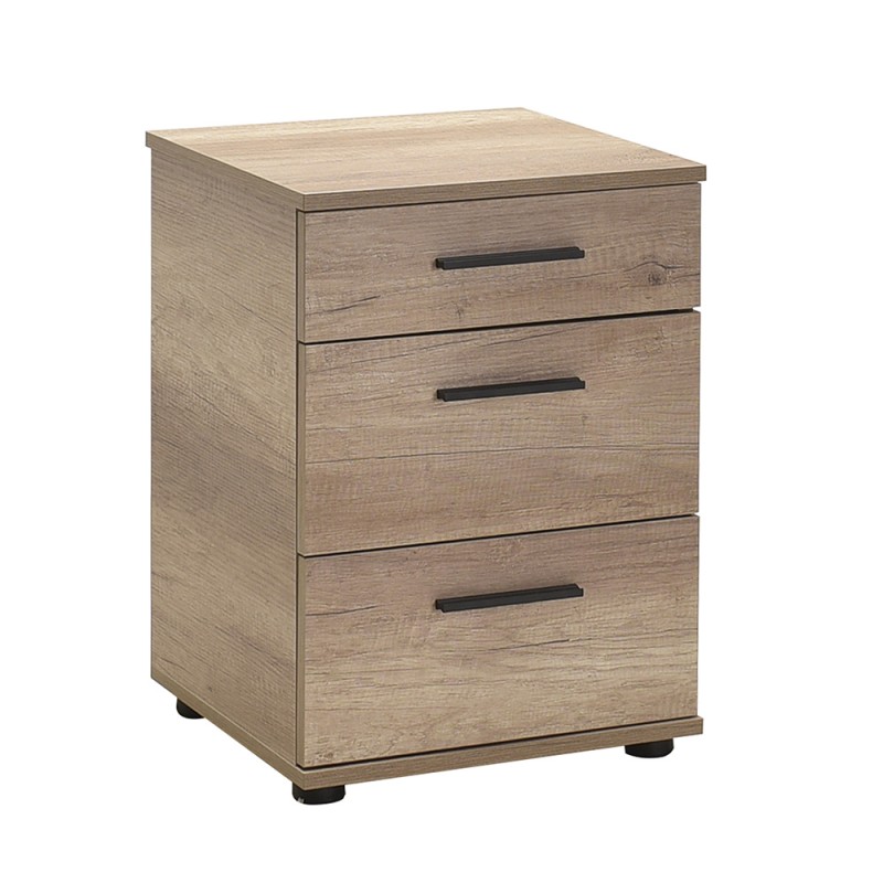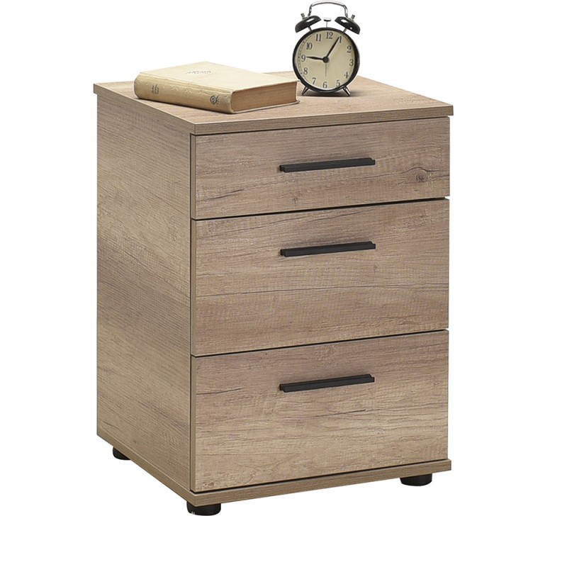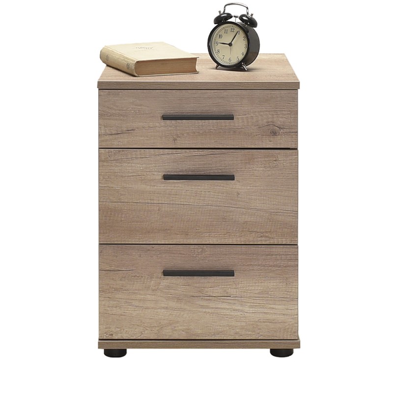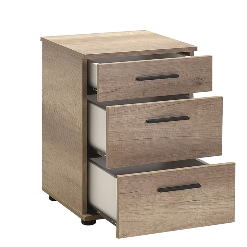 Κομοδίνο μελαμίνης με τρία συρτάρια σε σταχτί απόχρωση.