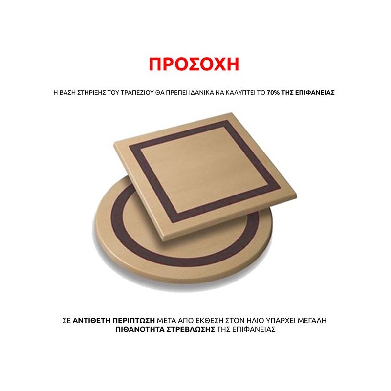 ΠΡΟΣΟΧΗ* Η βάση στήριξης του τραπεζιού θα πρέπει ιδανικά να καλύπτει το 70% της επιφάνειας. Σε αντίθετη περίπτωση μετά από έκθεση στον ήλιο υπάρχει μεγάλη πιθανότητα στρέβλωσης της επιφάνειας.