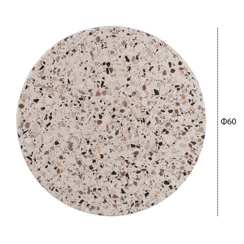 Επαγγελματική στρογγυλή επιφάνεια τραπεζιού σε χρώμα TERRAZZO (σαν μωσαϊκό), η οποία είναι κατάλληλη για επαφή με τρόφιμα και γενικά το υλικό είναι φιλικό προς το περιβάλλον. Μπορεί να χρησιμοποιηθεί σε καφετέριες, εστιατόρια, και τουριστικά καταλύματα, είτε σε εσωτερικούς, είτε σε εξωτερικούς χώρους.