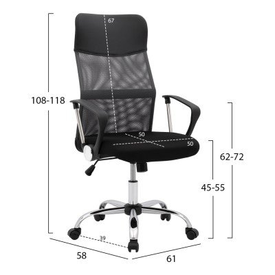 Το κύριο χαρακτηριστικό της καρέκλας είναι το ύφασμα της πλάτης που είναι mesh, δηλαδή διάτρητο. Αυτό σημαίνει ότι αφήνει την πλάτη να αναπνέει και να μην ιδρώνει προσφέροντας άνεση για πολύωρη χρήση.