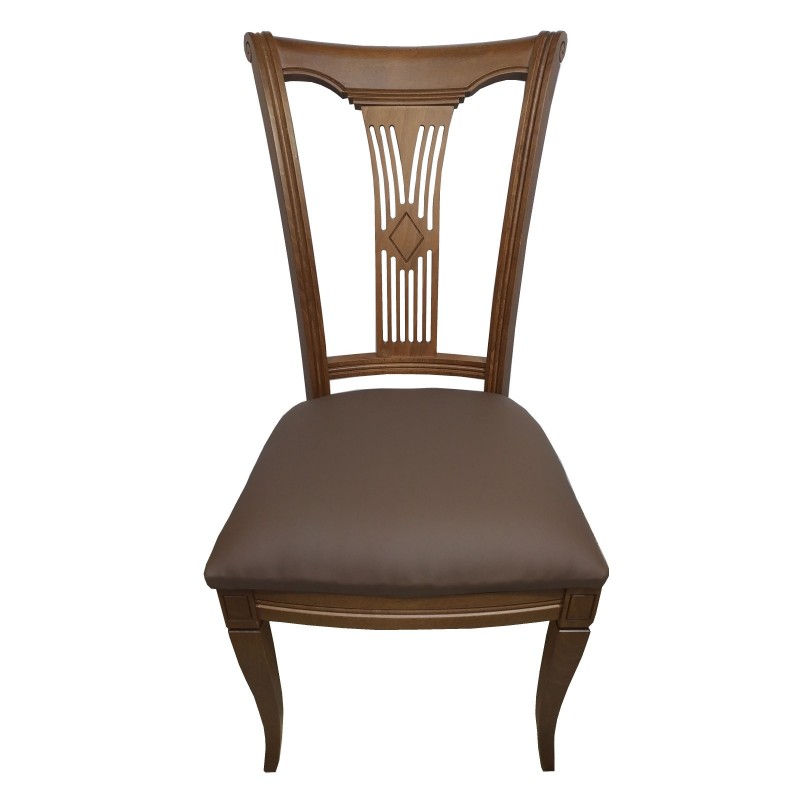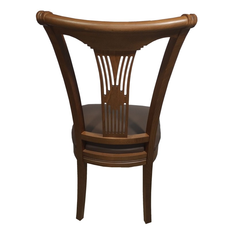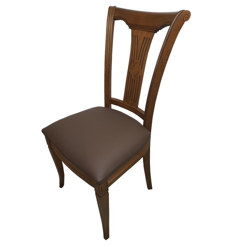 καρέκλα τραπεζαρίας Κ101 κλασικής γραμμής από μασίφ ξύλο οξιάς με ιδιαίτερα σκαλίσματα και καφέ δερματίνη επένδυση στο κάθισμα