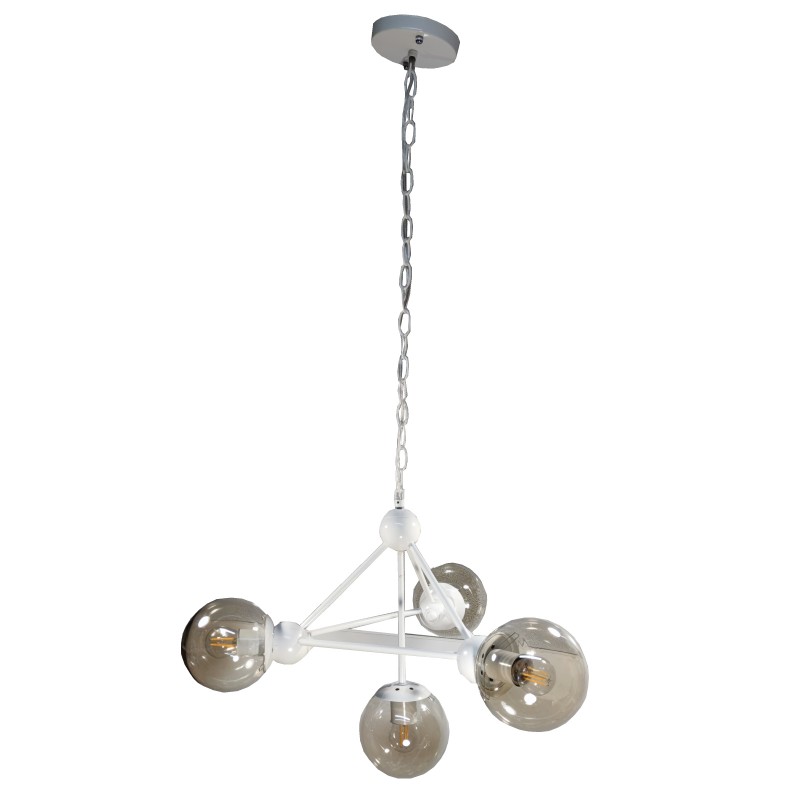 Τετράφωτο κρεμαστό φωτιστικό Ε14 με λευκό μεταλλικό σκελετό και μελί μπάλες διαστάσεων Φ60*Υ40εκ. μοντέρνου σχεδιασμού που ταιριάζει σε κάθε χώρο του σπιτιού σας ή του επαγγελματικού σας χώρου.
