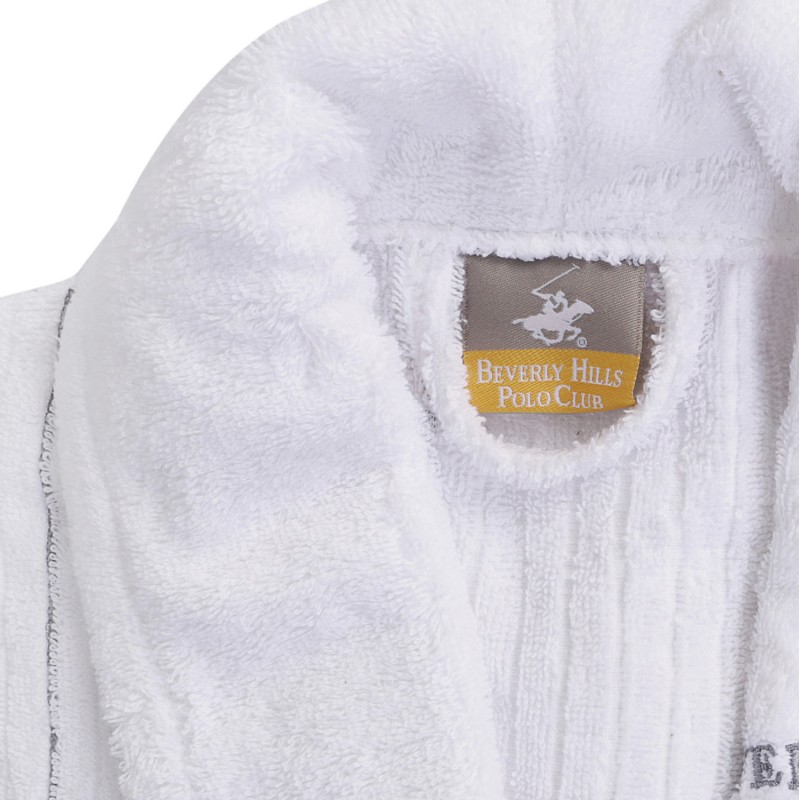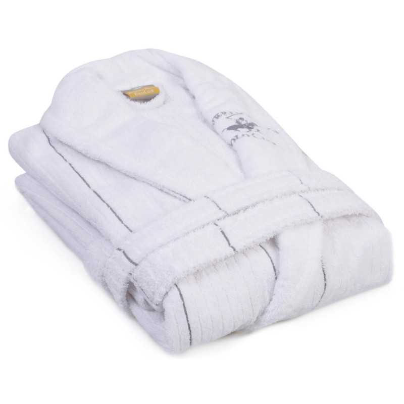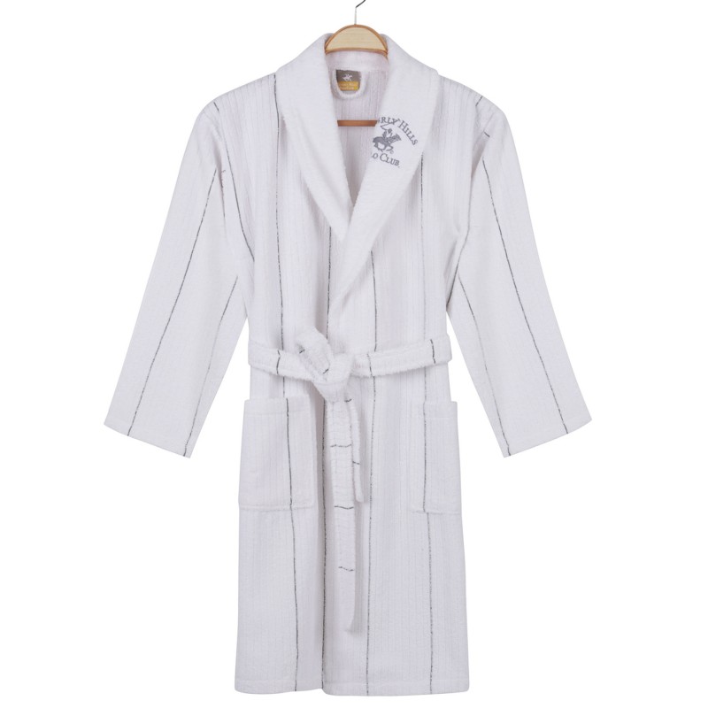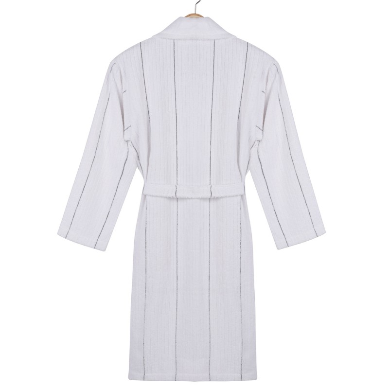 Πρόκειται για ένα μπουρνούζι, κατασκευασμένο από 98% βαμβάκι και 2% πολυεστέρα, 360gsm, σε λευκή απόχρωση με γκρι ρίγες.