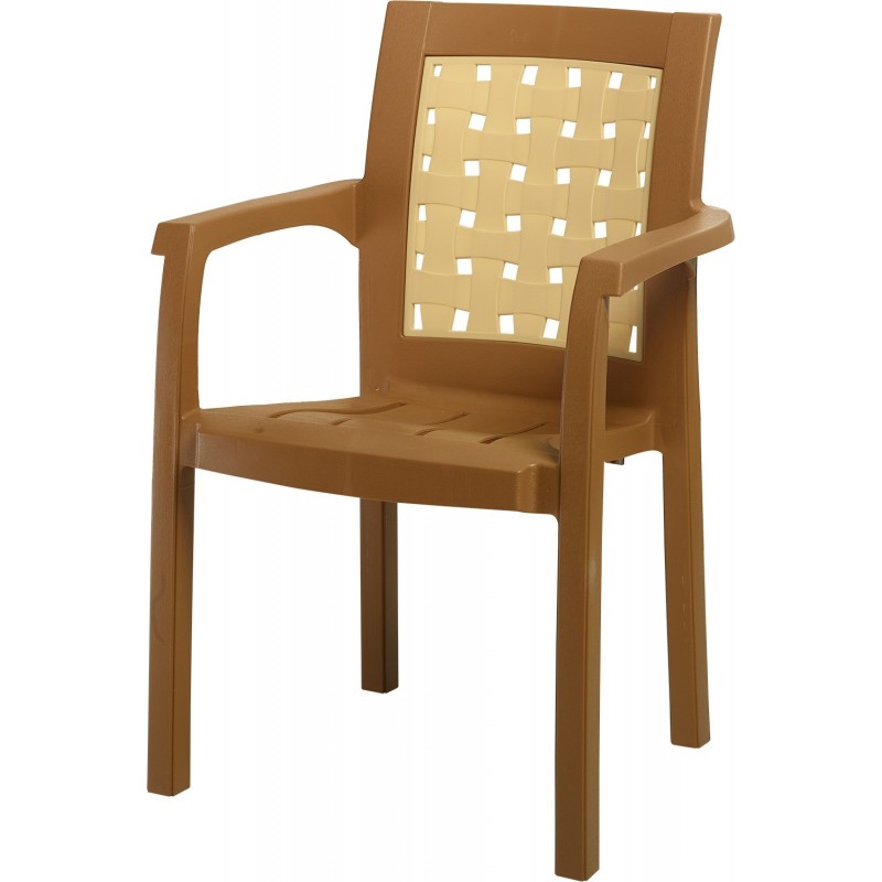Πλαστική πολυθρονα με ψιλή πλάτη τετράγωνο μπράτσο και σχέδιο στην πλάτη καφέ με μπεζ.