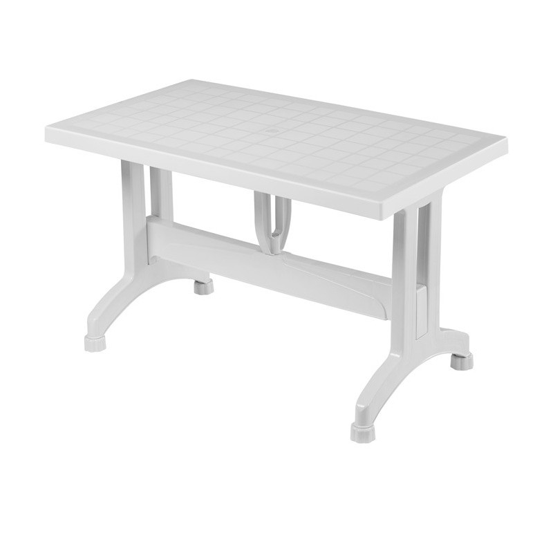 Πλαστικό τραπεζι με κεντρικό δοκό στήριξης για περισσότερη σταθερότητα διαστάσεων 120cm*70cm σε χρώμα άσπρο. Στα πόδια υπάρχουν ρεγουλατοροι για να ρυθμίζετε το ύψος αν το έδαφος ειναι ανώμαλο και επίσης στην επιφάνεια του τραπεζίου υπαρχει υποδοχή για ομπρέλα.