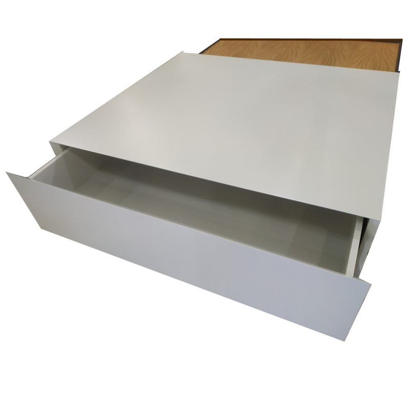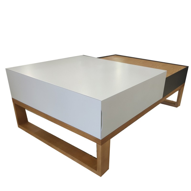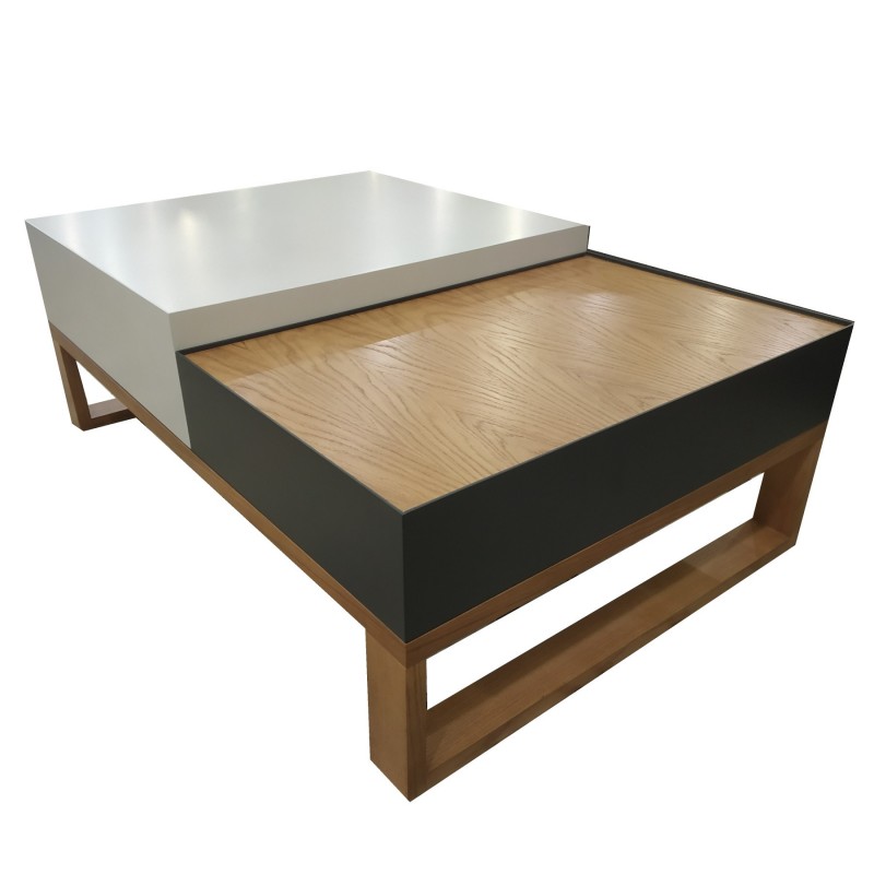 Τραπέζι σαλονιού με δυο επίπεδα και τρία χρώματα λευκό γκρι φυσικό με συρτάρι με μηχανισμό φρένου κατασκευασμένο από ξύλο δρυς με δυνατότατη αλλαγής χρώματος και διαστάσεων ( με εξτρά χρέωση )