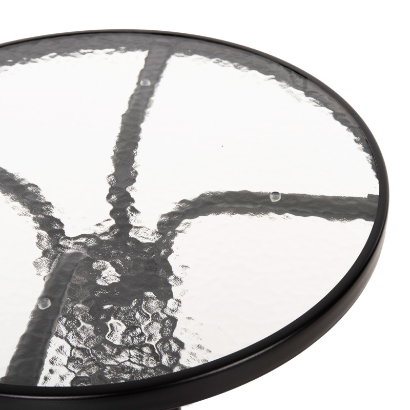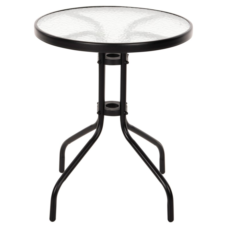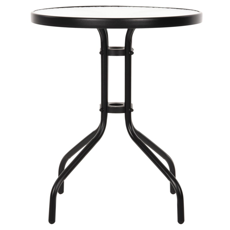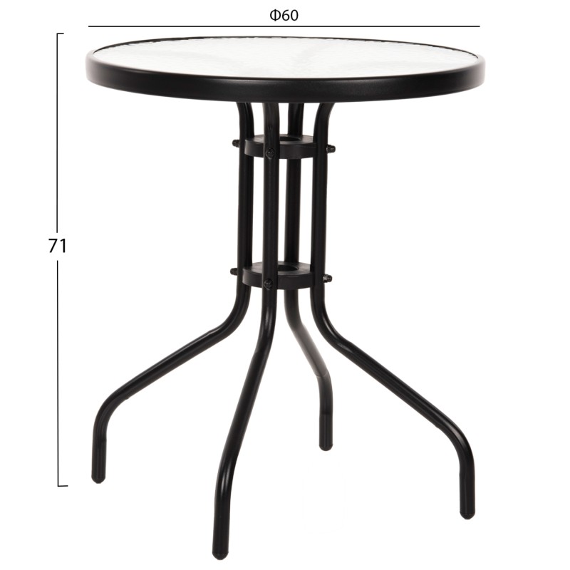 Τραπέζι στρογγυλό 70αρι από ενισχυμένο μεταλλικό σκελετό σε γκρι χρώμα και γυάλινη επιφάνεια από θερμικά επεξεργασμένο τζάμι ασφαλείας.