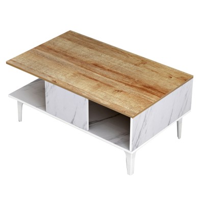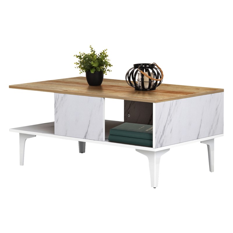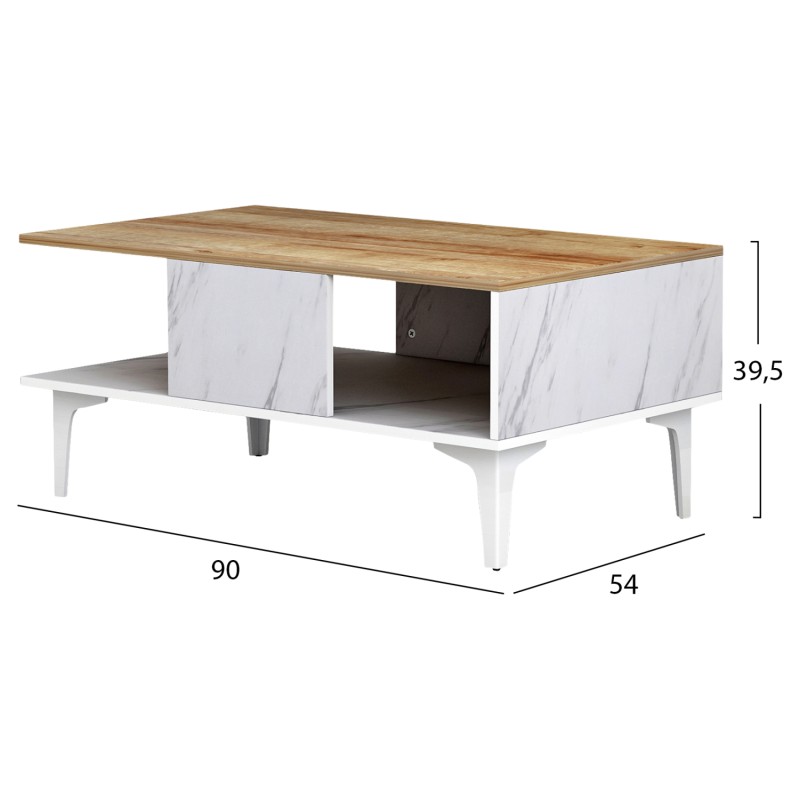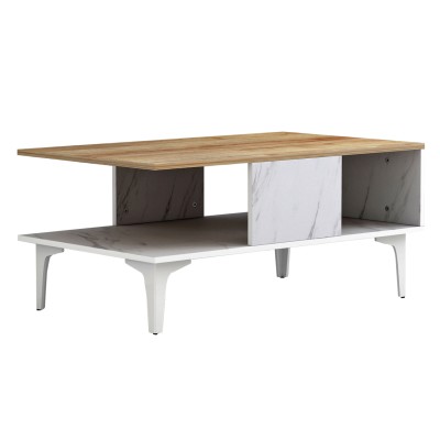 ΗΜ9036.13 τραπεζάκι σαλονιού----- Το τραπεζάκι μελαμίνης GUNNEZ είναι ένα πανέμορφο έπιπλο σε διχρωμία ΦΥΣΙΚΟΥ ΞΥΛΟΥ ΟΑΚ και εφέ ΛΕΥΚΟΥ ΜΑΡΜΑΡΟΥ. Το πρακτικό του design θα αλλάξει την εικόνα του σαλονιού ή του καθιστικού σας προς το καλύτερο. Πρόκειται για μια κατασκευή με μια ικανοποιητικού μεγέθους επάνω επιφάνεια και ένα ράφι από κάτω για επιπλέον χώρο για οτιδήποτε χρειαστεί. Τα πόδια είναι μεταλλικά σε ΛΕΥΚΟ χρώμα, επιτείνοντας την όμορφη διχρωμία. Η κομψότητα, η ποιότητα και το minimal πρωτοποριακό design, είναι κάποια χαρακτηριστικά από το τραπέζι σαλονιού, που έχει φτιαχτεί για εσένα.