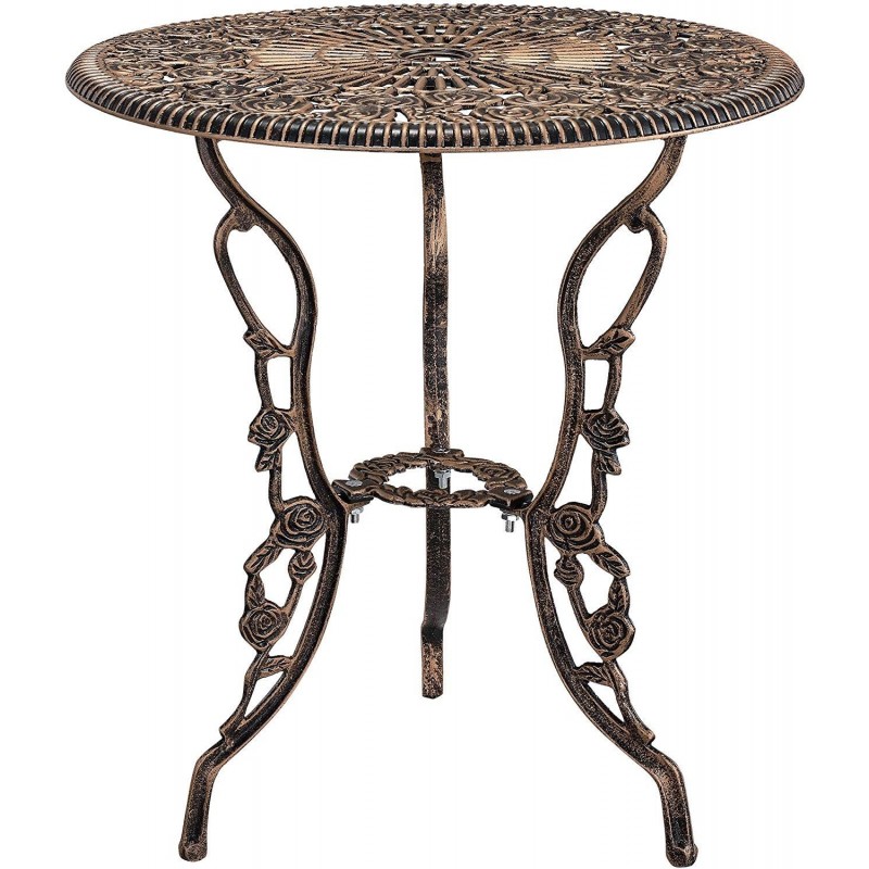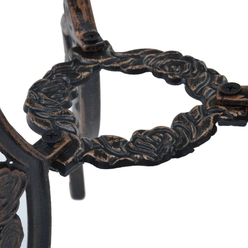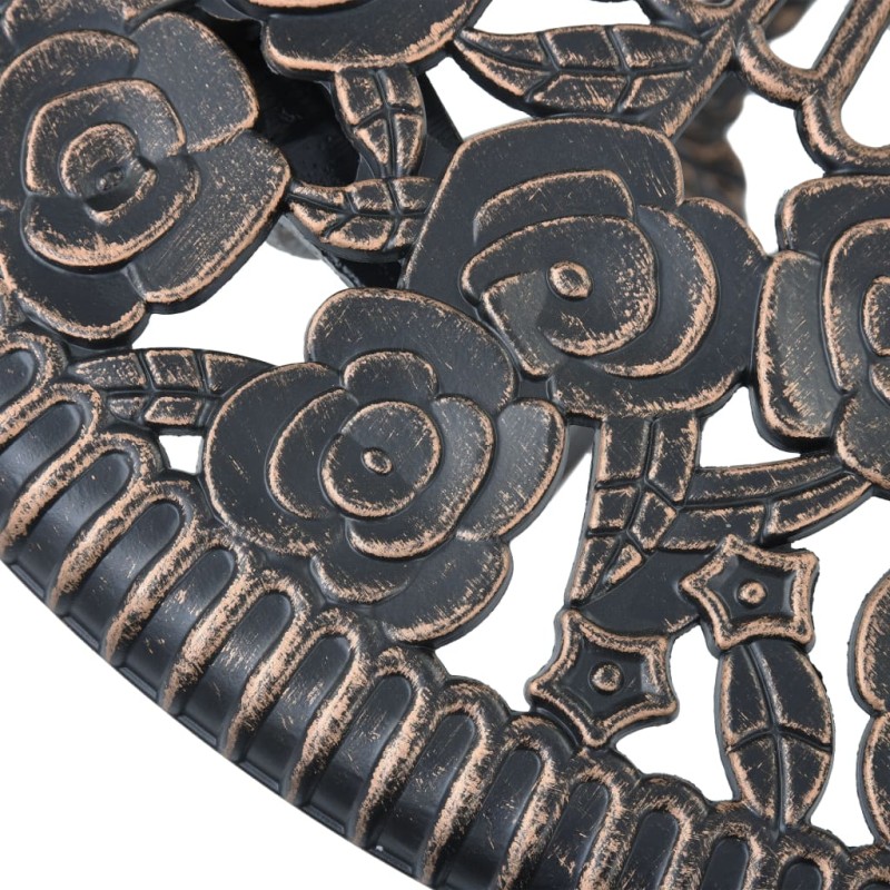 Σετ bistrot 3 τεμ τραπεζι με δυο καρέκλες με λουλούδια εξωτερικου χώρου σε χρώμα μπρονζε αντικε,το υλικό κατασκευής ειναι από μασίφ αλουμίνιο και μασίφ ατσάλι ότι καλύτερο από άποψης αισθητικής και ανθεκτικότερο στις εξωτερικές συνθήκες.