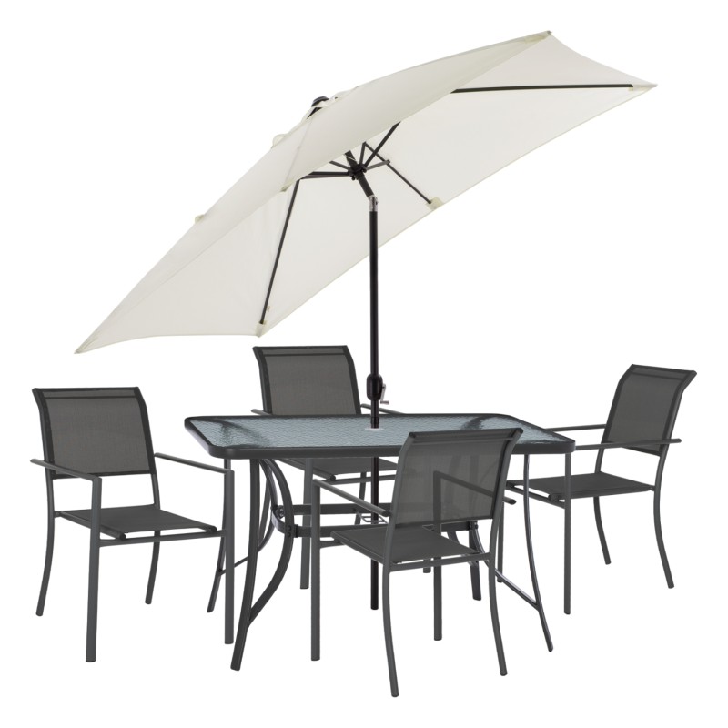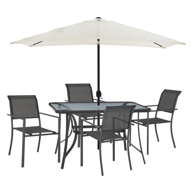 ΗΜ11821.10Σετ εξωτερικού χώρου με τραπέζι με ΓΚΡΙ μεταλλικό σκελετό και γυάλινη θολή ΕΝΙΣΧΥΜΕΝΗ επιφάνεια με τρύπα για ομπρέλα, 4 ΓΚΡΙ πολυθρόνες αλουμινίου με textilene σε ΓΚΡΙ χρώμα και ομπρέλα με ΣΚΟΥΡΟ ΓΚΡΙ σκελετό και ΜΠΕΖ ύφασμα.