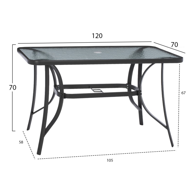 Ο σκελετός στο τραπέζι είναι μεταλλικός με ηλεκτροστατική βαφή. Ο σκελετός στις πολυθρόνες και στην ομπρέλα είναι από αλουμίνιο, επίσης με ηλεκτροστατική βαφή.