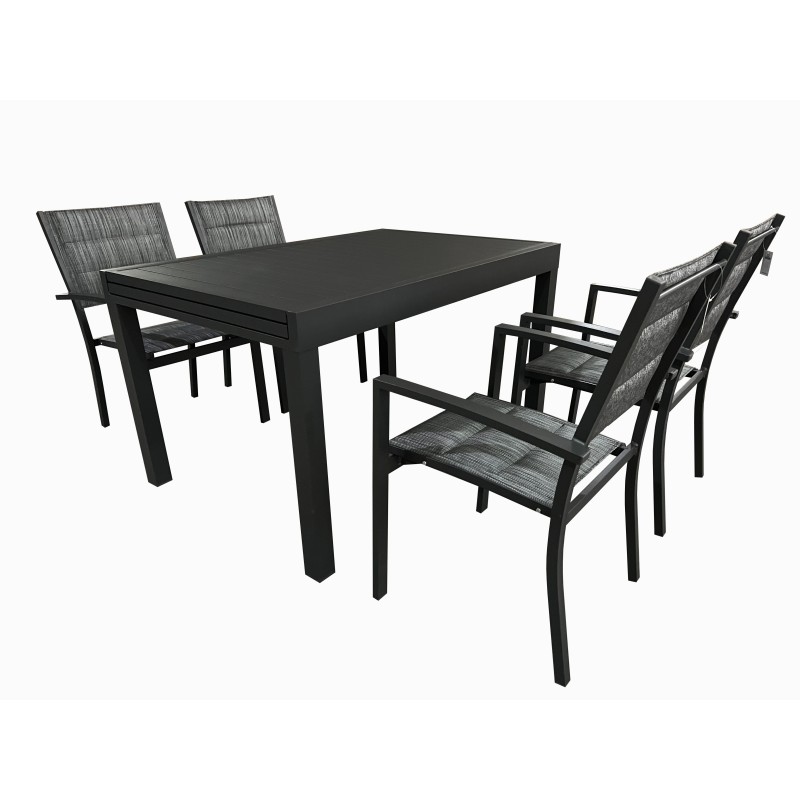Σετ τραπεζαρίας επεκτεινόμενο εξωτερικού χώρου κατασκευασμένη από αλουμινίο και ύφασμα textilene υψηλής ποιότητας και ανθεκτικότητας στον χρόνο σε χρώμα ανθρακί. Μία κομψή επιλογή τόσο για τον προσωπικό όσο και για τον επαγγελματικό σας χώρο καθώς μπορεί να συνδυαστεί με μεγάλη ποικιλία χρωμάτων και επίπλων. Ιδανική επιλογή για να κοσμήσει το μπαλκόνι ή τον κήπο σας και μπορεί να σας χαρίσει στιγμές αναπαυτικότητας και χαλάρωσης. Η τραπεζαρία μπορεί να είναι το σημείο όπου θα συναντάτε την οικογένεια και τους φίλους σας. Αποτελείται από έξι πολυθρόνες και ένα τραπέζι.