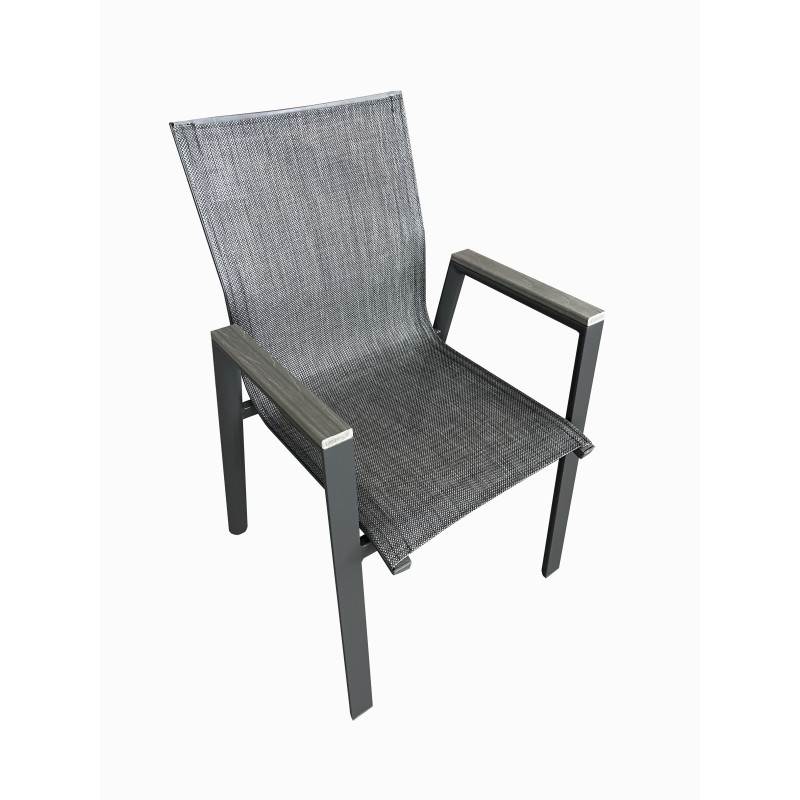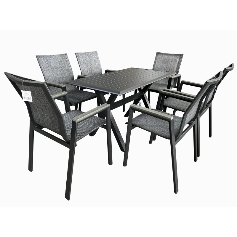 Σετ τραπεζαρίας εξωτερικού χώρου κατασκευασμένη από αλουμινίο και ύφασμα textilene υψηλής ποιότητας και ανθεκτικότητας στον χρόνο σε χρώμα ανθρακί. Μία κομψή επιλογή τόσο για τον προσωπικό όσο και για τον επαγγελματικό σας χώρο καθώς μπορεί να συνδυαστεί με μεγάλη ποικιλία χρωμάτων και επίπλων. Ιδανική επιλογή για να κοσμήσει το μπαλκόνι ή τον κήπο σας και μπορεί να σας χαρίσει στιγμές αναπαυτικότητας και χαλάρωσης. Η τραπεζαρία μπορεί να είναι το σημείο όπου θα συναντάτε την οικογένεια και τους φίλους σας. Αποτελείται από έξι πολυθρόνες και ένα τραπέζι.