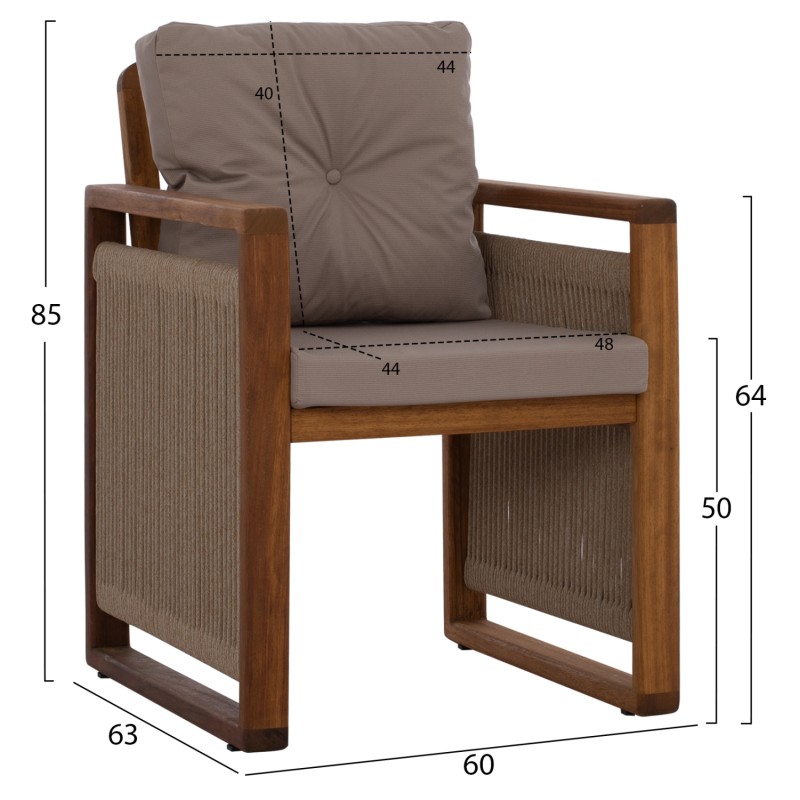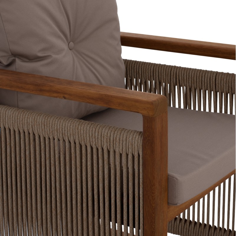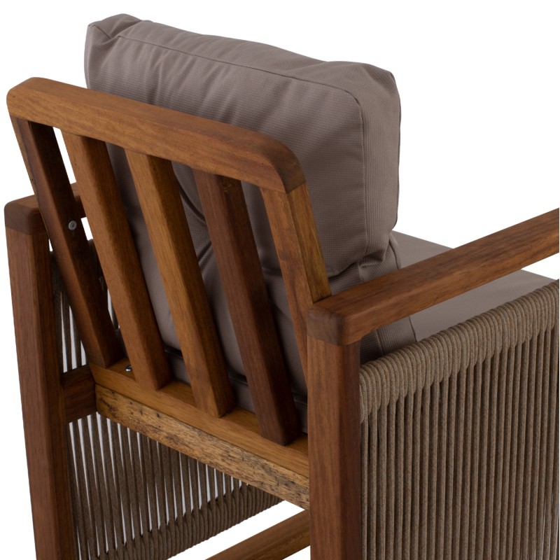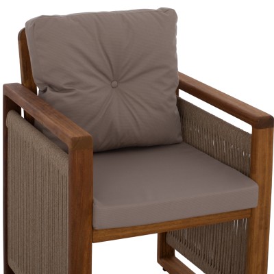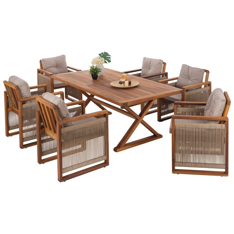 ΗΜ5878.01---Σας παρουσιάζουμε το εντυπωσιακό και νέο χειροποίητο σετ τραπεζαρίας εξωτερικού χώρου, με τραπέζι και 6 πολυθρόνες. Ένα σετ που θα το λατρέψετε με την πρώτη ματιά. Το μεγάλο ξύλινο τραπέζι με τις βάσεις σε χιαστί διάταξη στις 2 άκρες που ενώνονται με μια μεγάλη δοκό που λειτουργεί και ως υποπόδιο, είναι πανέμορφο και στιβαρό. Οι πολυθρόνες είναι εξίσου εντυπωσιακές. Το σχοινί που υπάρχει στις πλευρές τους είναι πανέμορφο στην όψη ενώ η στιβαρότητά τους είναι εμφανής χάρη στις φαρδιές τετράγωνες βάσεις που το επάνω μέρος τους αποτελεί τα μπράτσα αυτών των πολυθρόνων. Το κάθισμά τους είναι φαρδύ ενώ η πλάτη τους έχει μια ελαφριά κλίση προς τα πίσω πράγμα που επιτείνει την άνεση που προσφέρουν, σε συνδυασμό με τα αναπαυτικά μαξιλάρια τόσο στο κάθισμα όσο και στην πλάτη. Τα μαξιλάρια είναι επενδυμένα με ποιοτικό ύφασμα σε ΜΠΕΖ χρώμα που ταιριάζει απίστευτα με το φυσικό χρώμα του ξύλου αλλά και με το φυσικό χρώμα του σχοινιού. Τι άλλο να ζητήσει κανείς για να αναβαθμίσει τον κήπο, το μπαλκόνι ή την αυλή του;