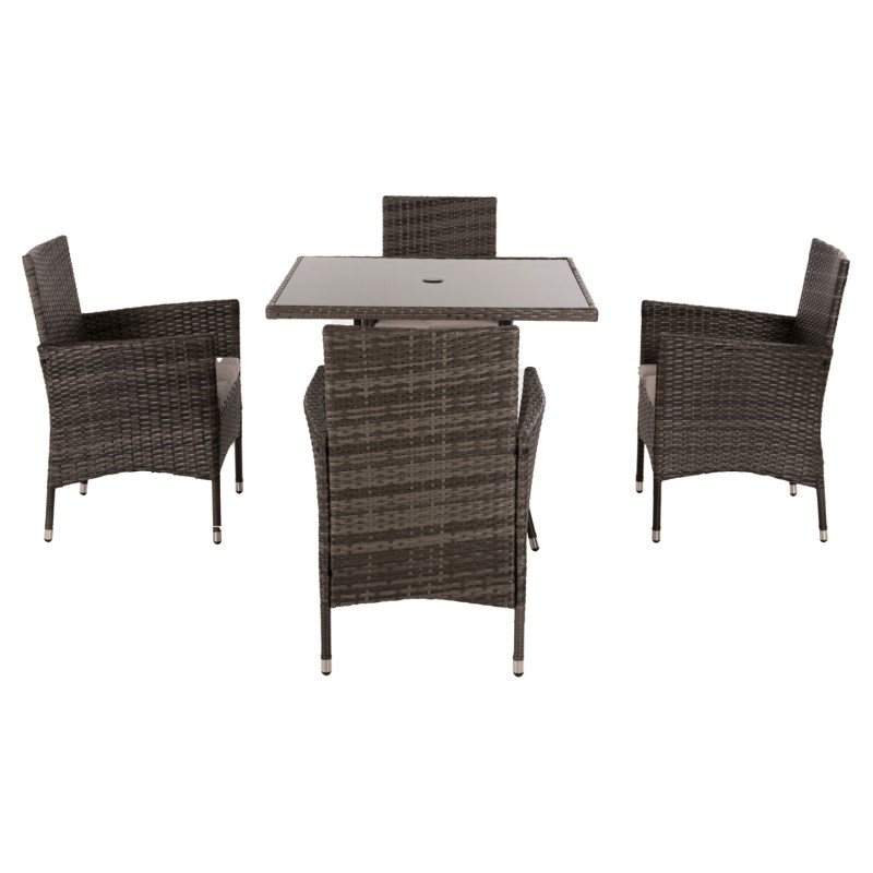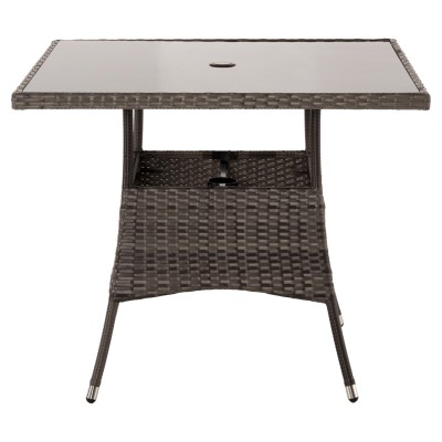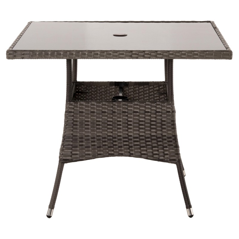 Το τραπέζι είναι τετράγωνο, με διακόσμηση από καφέ συνθετικό Rattan επίσης, ενώ η γυάλινη επιφάνεια διαθέτει στο κέντρο της τρύπα για ομπρέλα η οποία στηρίζεται και σε υποδοχή στον μεταλλικό σκελετό του τραπεζιού.