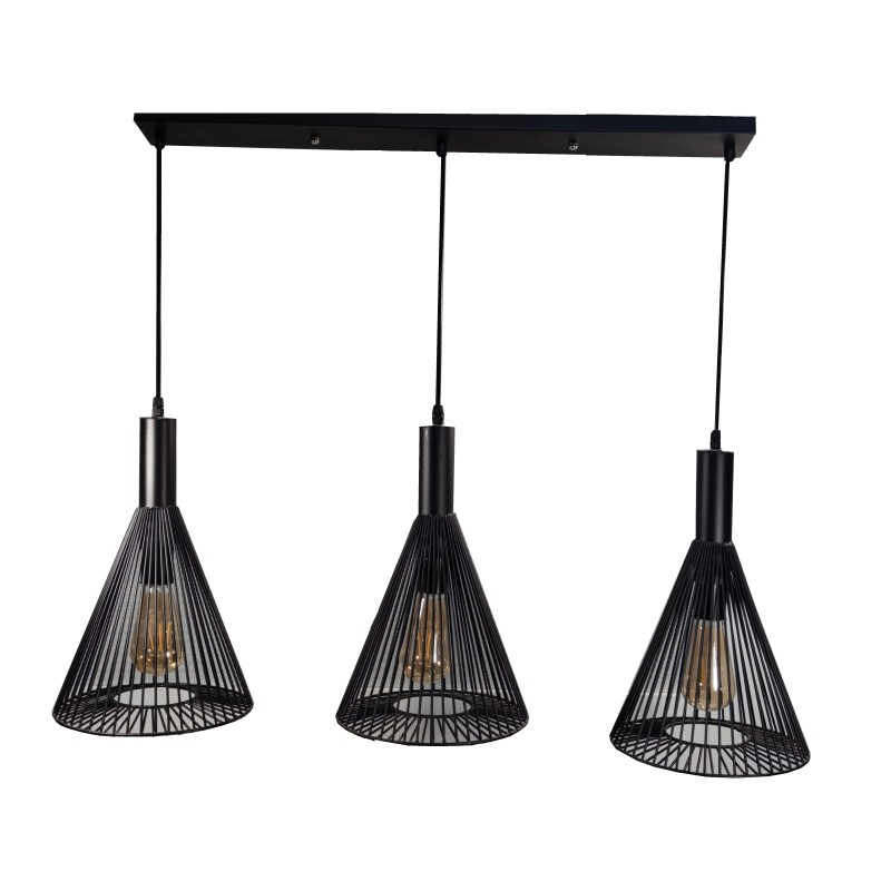 Τρίφωτο κρεμαστό φωτιστικό Ε27 με μαύρο μεταλλικό σκελετό σε σχήμα πυραμίδας μοντέρνας γραμμής 70*10*3εκ.
